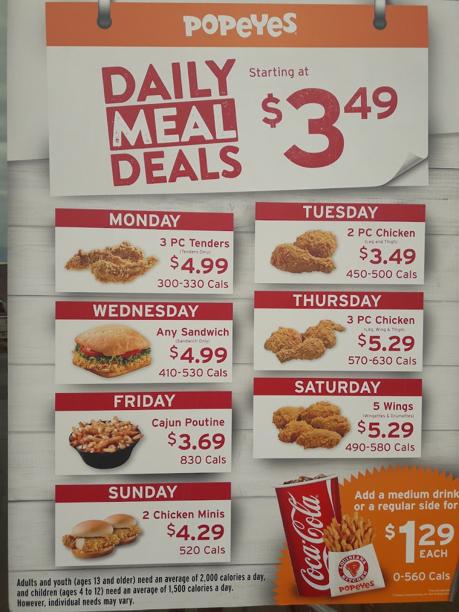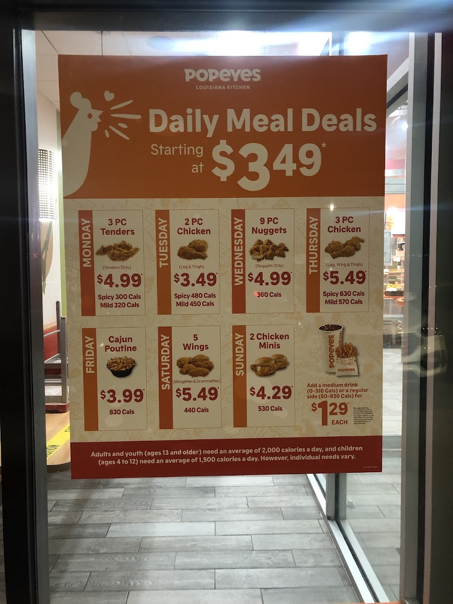 Always come on Monday for the daily deal. The staff are very kind, the portions are generous, and the food is always fresh, even at off-hours. My favourite Popeyes to go to!